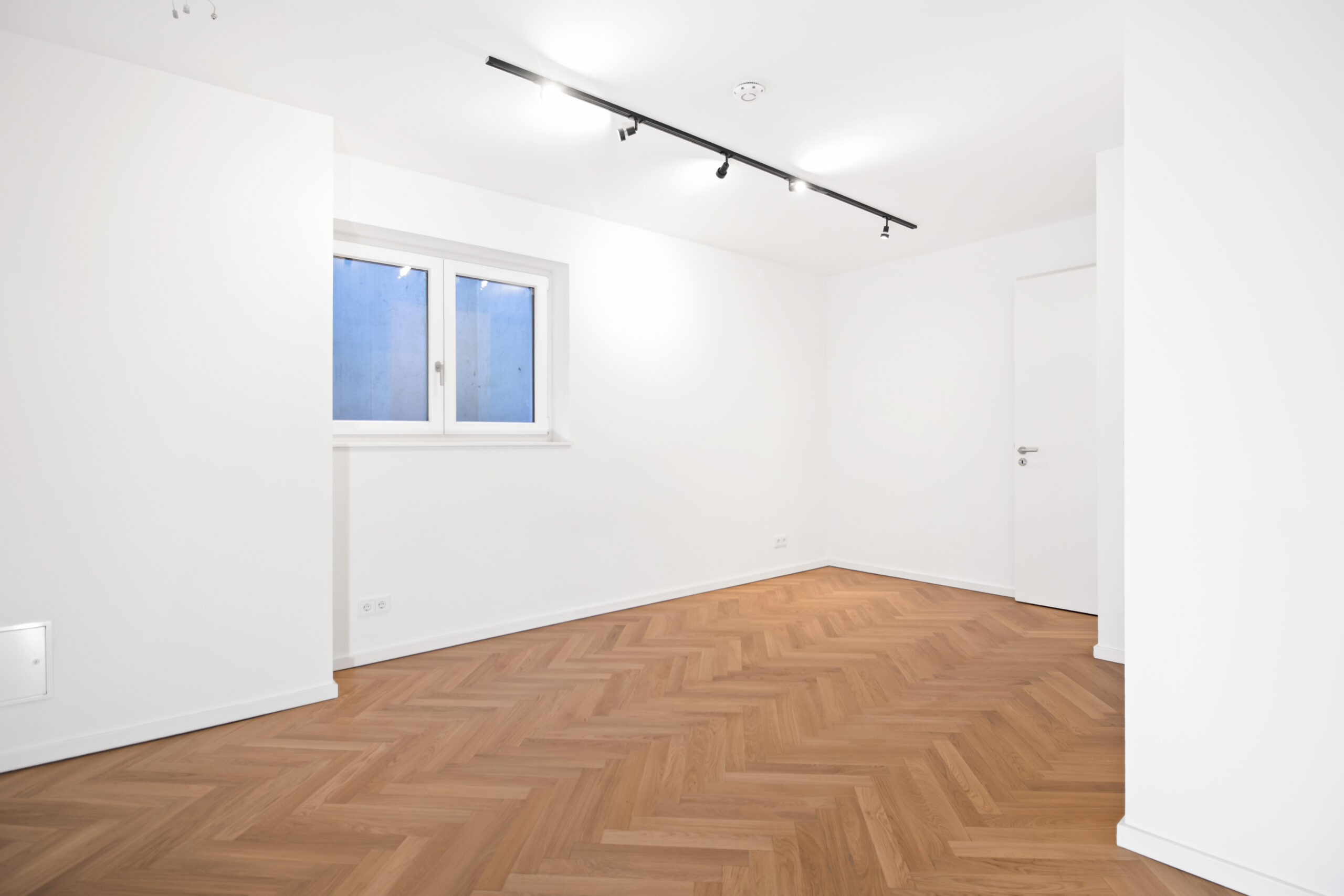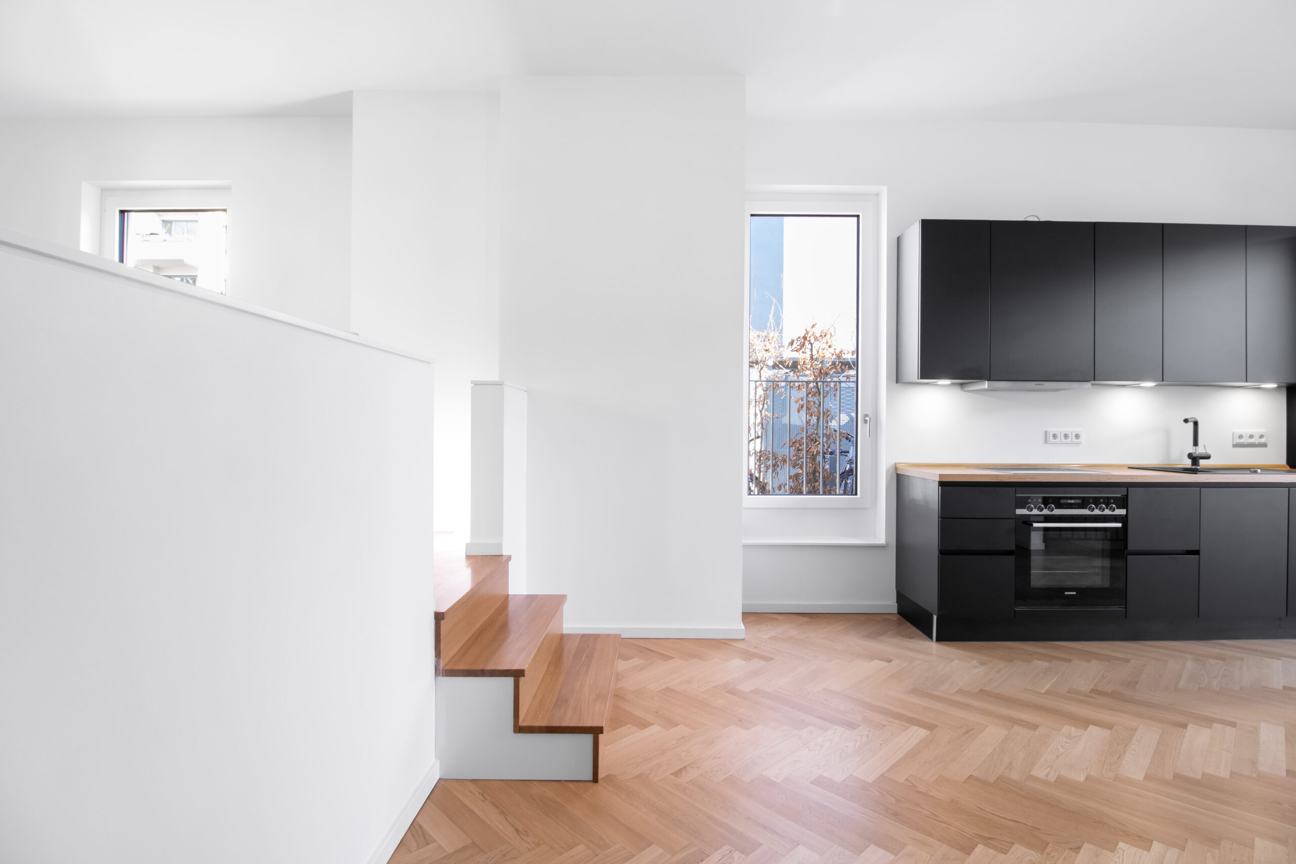 Bright, floor-to-ceiling windows and warm herringbone oak parquet flooring create an elegant, welcoming atmosphere throughout. The open-plan kitchen and living area on the upper level opens directly onto the quiet outdoor space via French doors. The separate sleeping area on the lower level provides the privacy and calm you’d want for rest, or a dedicated home office.